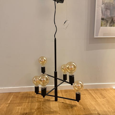 Takskena i metall med textilklädda 1,5m kablar. Stor lamphållare (E27) Max 60W eller motsvarande i halogen, lågenergi eller LED. Ljuskällor ingår ej.