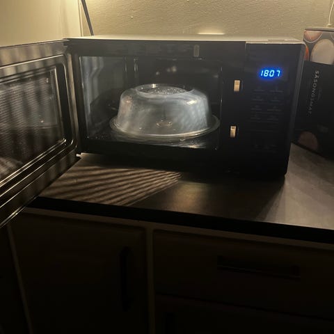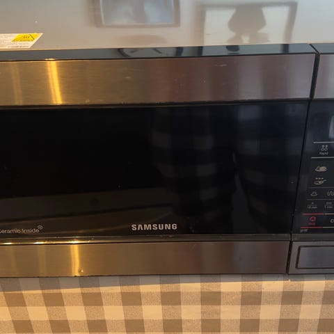 Samsung mikrovågsugn i stål. Mikrovågsugnen har en rostfri stålyta och en digital kontrollpanel med förinställda knappar för olika matlagningsalternativ som popcorn, potatis, pizza och grönsaker. Den har en roterande tallrik inuti för jämn uppvärmning.