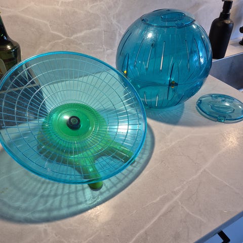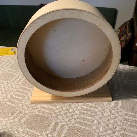 Stort hamsterhjul i nyskick. Är använd men är noggrant diskad. Antingen är den 28,5 eller 30,5cm stor minns ärlig talat inte.