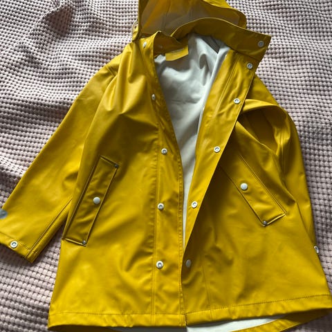 Gul regnjacka i lång modell, passar bra för vår och sommar.