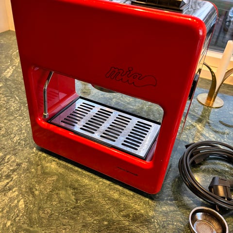 DeLonghi Icona Vintage Espressomaskin i beige färg. Maskinen har en portafilter och ett rostfritt stålgaller för koppar. Designen är retroinspirerad med kromdetaljer.