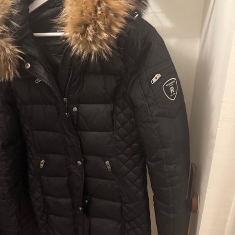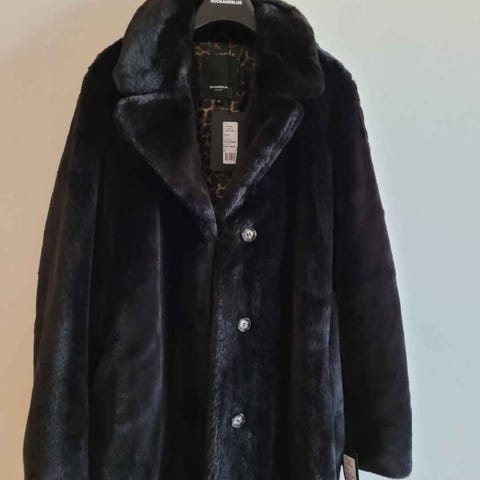 Svart joplin kappa med pälskrage och huva från Rockandblue. Kappan har en innerficka med dragkedja och stängs med knappar. Tyget liknar svart fårull.