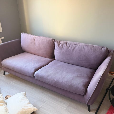 2 st använda soffor från Mio. Märket är Madison. Den ena är hel och fungerar fullt ut, den andra har ett stöd ben för att stabilisera upp botten.