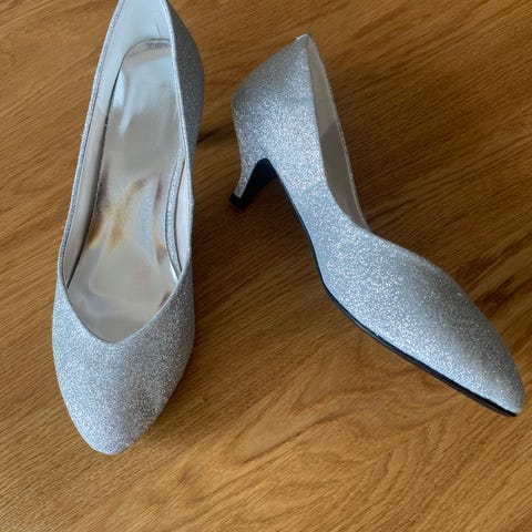 Vita klackskor i storlek 38. Skorna har en rem över vristen med spänne och en slät yta. Passar för formella tillfällen.