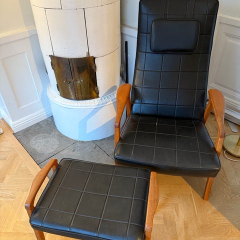 Både fåtölj och fotpall är i absolut toppskick, som nya. Mycket sparsamt använda, inga fläckar, inget slitage och ingen nedsutten stoppning. Stadig konstruktion och mycket hög sittkomfort.