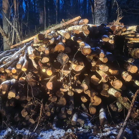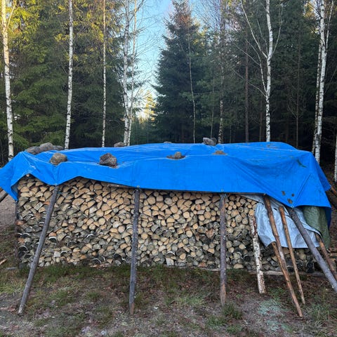 Ved lövved och björkved från en gallring, längd ca 4- 5 meter lite klenare ved. 300 kr kubiken travat mått,