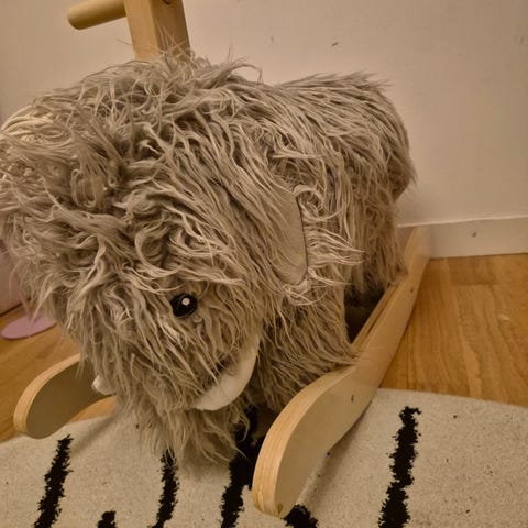 Ett får som gunghäst i trä. Stabil och fin. And av två barn. Fungerar utmärkt och inga synliga skador.