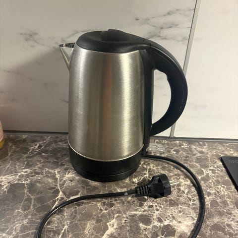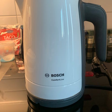 Bosch vattenkokare i vit färg med handtag och vattennivåindikator. Elektrisk med avtagbar sladd och lock för enkel användning.