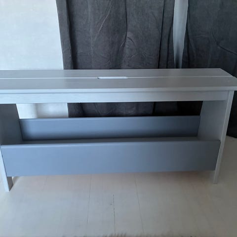 Svart bänk med jalusi dörr och två lådor.