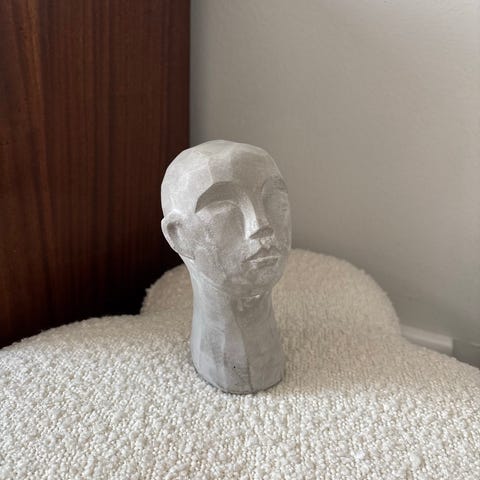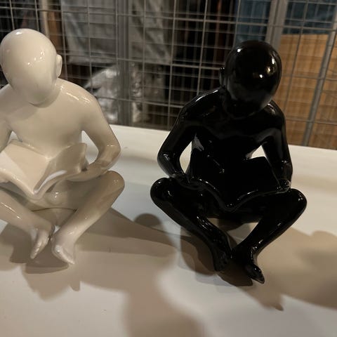 Två dekorativa skulpturer föreställande ansikten, tillverkade i vitt material. Skulpturerna har en stiliserad och modern design med tydliga ansiktsdrag. De är avsedda för inomhusbruk och kan användas som prydnadsföremål i hem eller kontor.