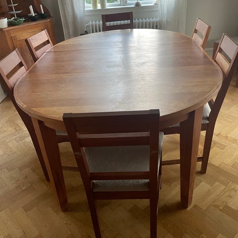 Matgrupp bestående av ett bord i trä med rundad form och flera stolar i trä med rottingdetaljer och klädda sitsar. Bordet har en ljus träfinish och stolarna har ljusa klädda sittdynor. Gruppen passar för matrum och vardagsrum.