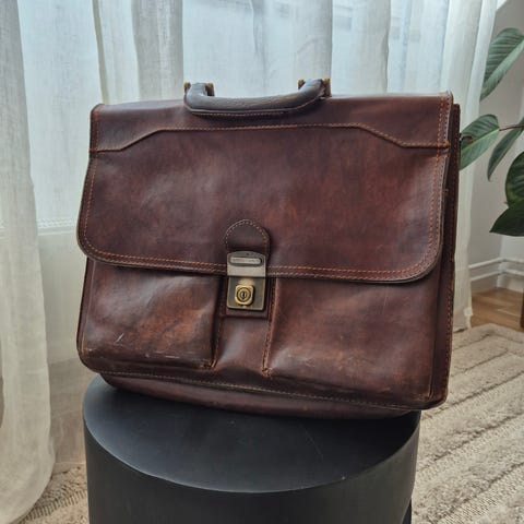 Säljer en Portfölj av det kända och välrenommerade märket Baron. Brunt läder och spänne i gulmetall.