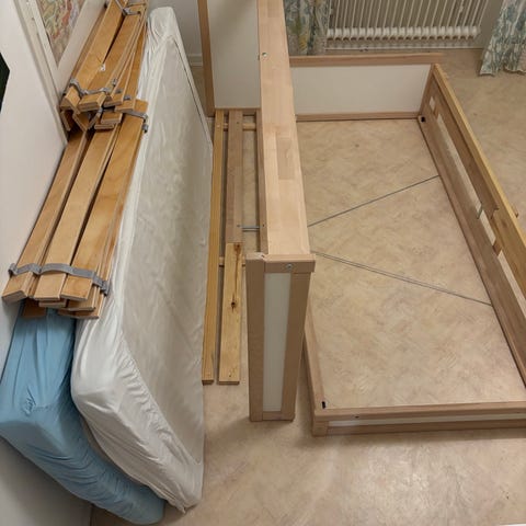 Säng komplett med madrass, madrasskydd och säng kappa, endast använd som gästsäng.