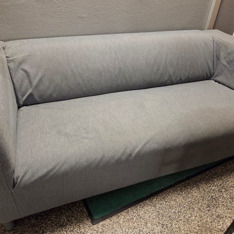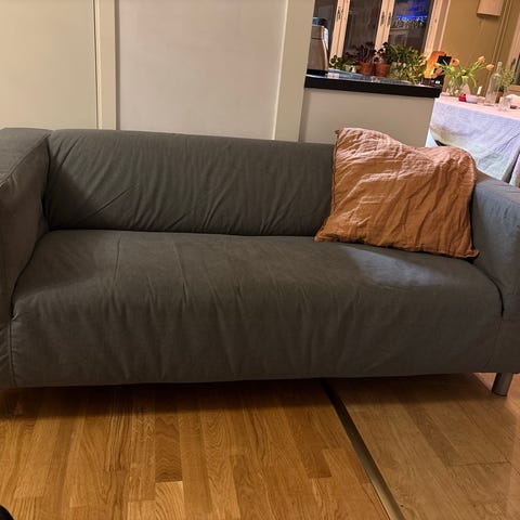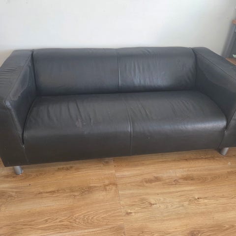 Ni behöver vara två personer som hämtar då den är tung. Soffan behöver monteras ner (4 delar = ryggstöd, armstöd, sits) för att komma ut genom dörren.