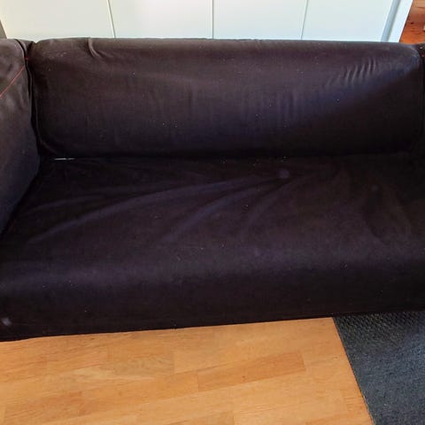 Klädd med jeanstyg som är lite blekt på armstöden. Modellen finns hos Bemz om man vill byta överdragstyg.