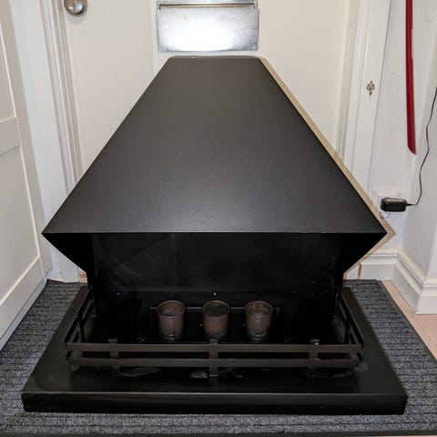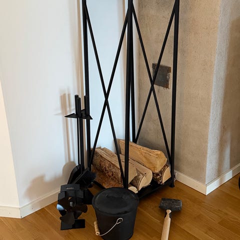 Vedkorg, gnistskydd, eldrist, skyffel, borste, eldgaffel från Bohlin smide. Använts alldeles för lite.