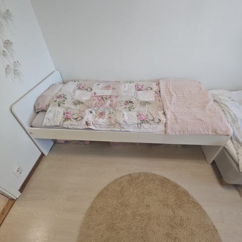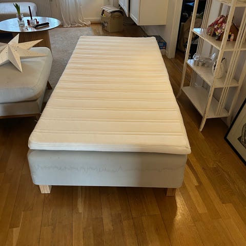 200kr säng 90 cm med ny bäddmadrass och skydd. Sängkappa ingår