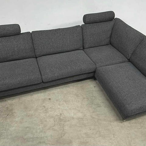 Stor soffa med plats för många. Svart konstläder och dynor i svartvitt tyg.