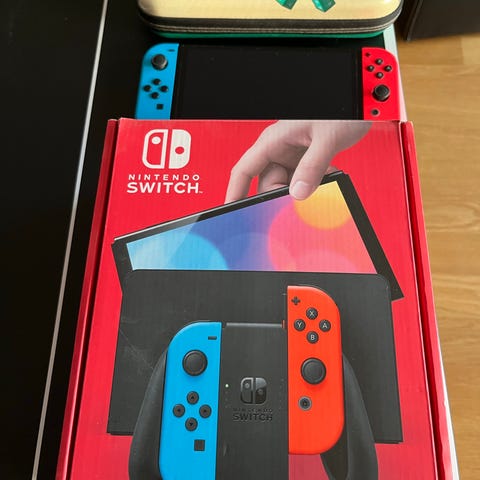 samt ett bärbart fodral med Super Mario-motiv och en spelkassett. Konsolen har en OLED-skärm och är avsedd för allmän användning.