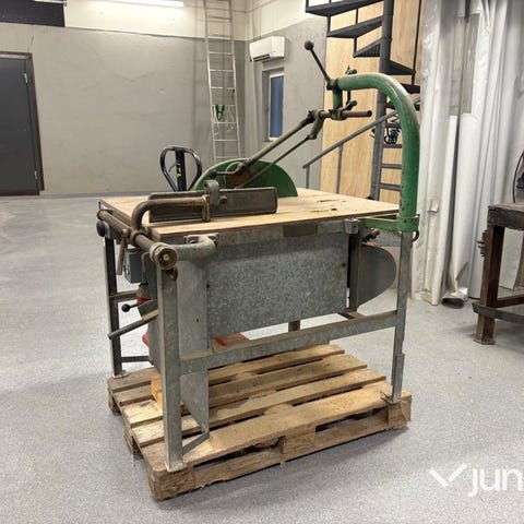 Woodster kombisåg med metallbord och skydd för sågblad. Utrustad med styrskena och dammutsug. Passar för kapning, planhyvling och sågning av trä och liknande material.