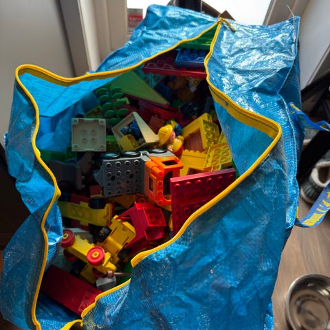 Blandat låda men duplo bland annat tåg och en stor byggplatta