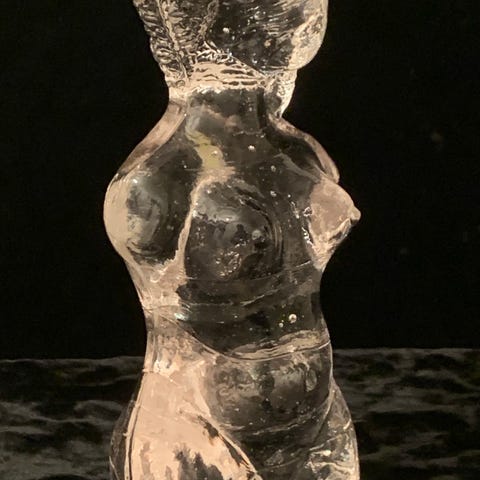 Glas skulptur av en kvinnokropp från Målerås glasbruk. Design Erika Höglund