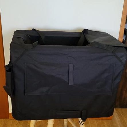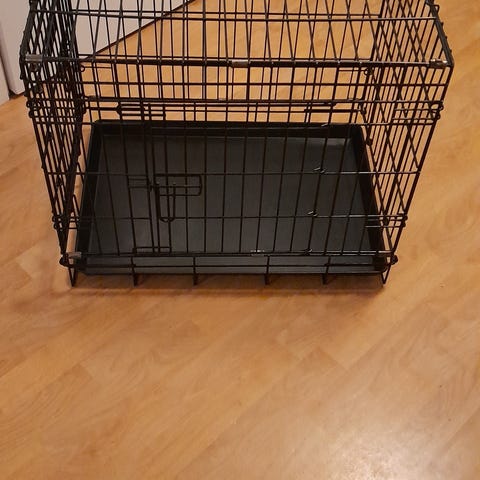 Hundbur i svart metall med en plastbotten. Burens konstruktion består av metallstänger och den har en bottenplatta i plast som kan tas bort för rengöring.