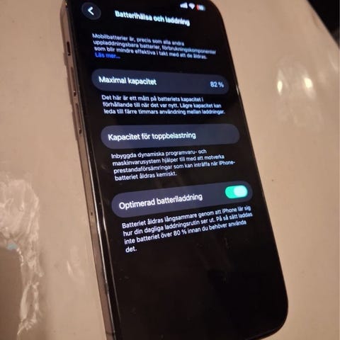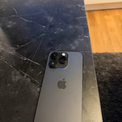 Apple iPhone 14 Pro smartphone med 128 GB lagringskapacitet i svart färg. Telefonen har en skadad baksida med synliga sprickor, vilket påverkar utseendet på telefonen. Det är inget fel på mobilen utan att den har en sprucken bakskärm ingen typ av spricka eller fel i framskärmen. Pris kan diskuteras