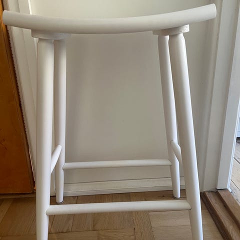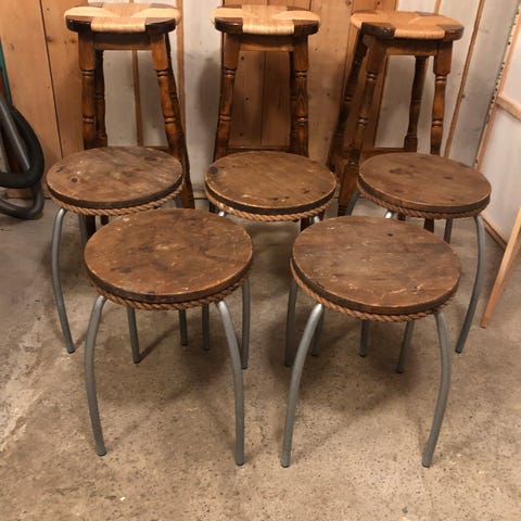 Pallar av ljust lätt träslag. Sitsarna är flätade av enevidjor.