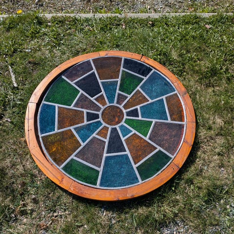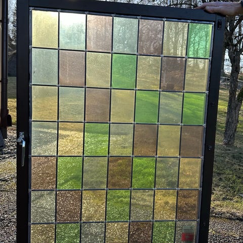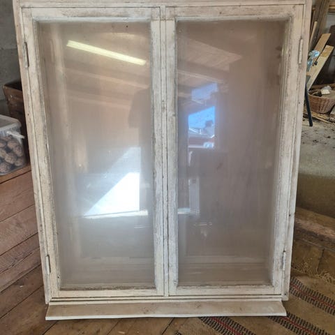 Två stycken gamla glas med blyinfattning som skulle använts till ett projekt som blev ändrat. Glasen är av gammal fin kvalitet och mycket originella. Endast glasen har ca måtten 34x58 cm. Finns två gamla fina beslag på dörrarna också.