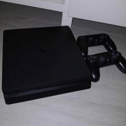 Sony Playstation 4 spelkonsol i svart färg. Inkluderar en handkontroll. Konsolen är avsedd för spel och underhållning.
