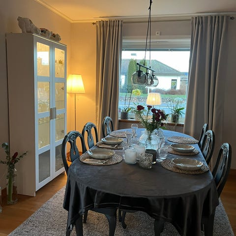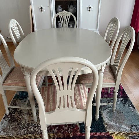 Matsalsmöbel i mycket fint skick. Dock fläckar på två av stolarna, se bilder.