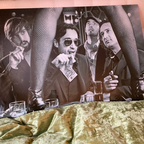 Yellow Korner Selection fotokonst tavla med färgfoto av en kvinna i nunneklädsel och stor hatt som röker cigarett som heter "Smoking Nun Cinecitta".