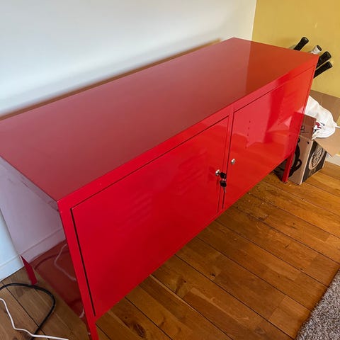 Två röda plåtskåp från Ikeas PS-serie. Såldes från slutet av 1990-talet och fram i början av 2000-talet