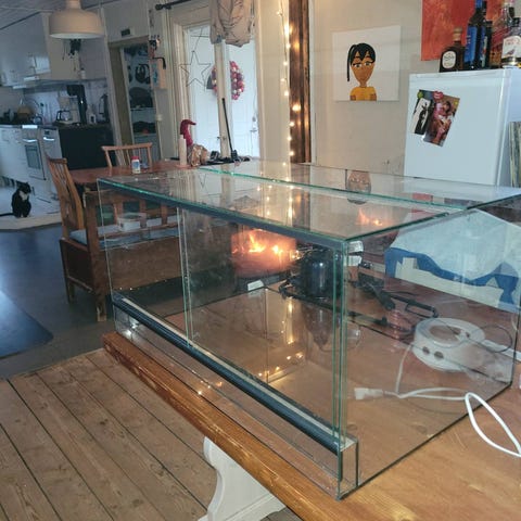 Hemma byggt terrarium av en gammal kista, bor idag en kungspyton på 7 år som följer med