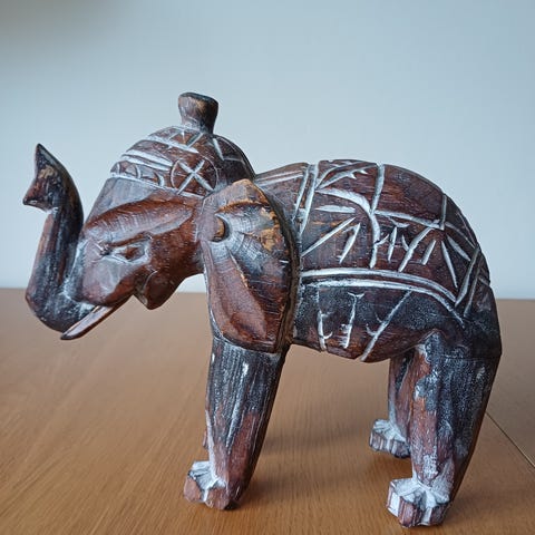 Dekorativ elefantfigur med detaljerade utsmyckningar. Figuren har en gråaktig färg med inslag av brunt och är utformad med mönstrade ornament. Passar som prydnadsföremål i olika rum.