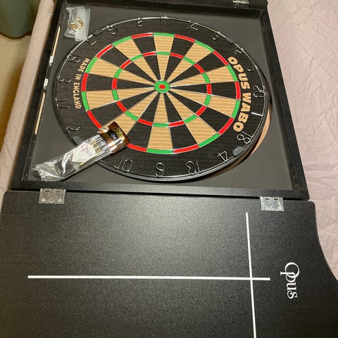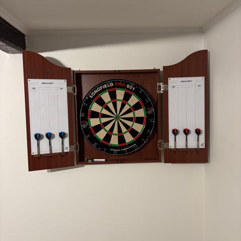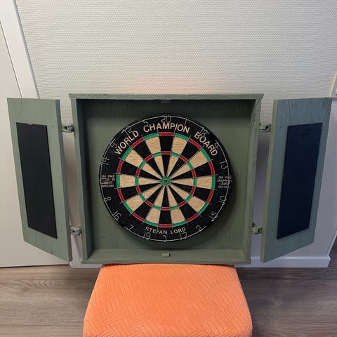Begagnad darttavla i kabinett, lite småskavanker eftersom den har många år på nacken. Ändå inte använd så jättemycket. Hämtas på plats!