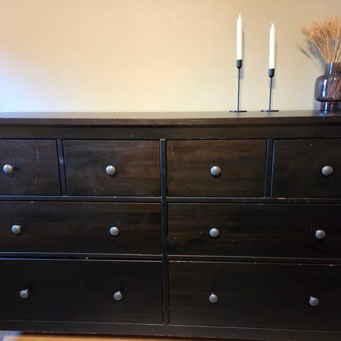 Brunsvart ikea hemnes byrå med åtta lådor.