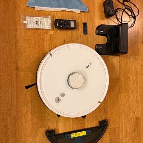 Electrolux Pure i9 robotdammsugare i svart färg. Utrustad med laddningsstation. Designad för automatiserad golvrengöring med roterande sidoborste och hjul för navigering.