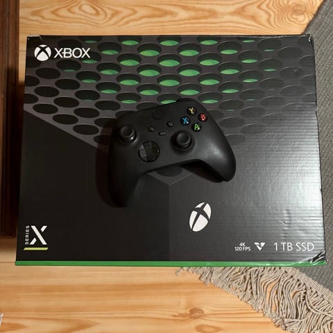 Xbox Series X spelkonsol med 1 TB SSD-lagring. Konsolen levereras med två handkontroller och har avancerade grafik- och prestandafunktioner för spel.