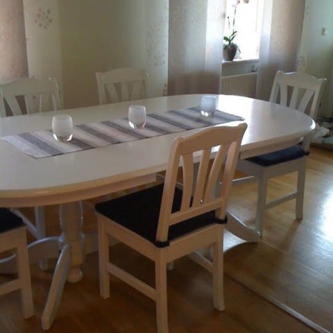 Finns en iläggsskiva under bordet som förlänger det med 49cm. Benen är avskruvade. Behöver slipas och målas. Tungt, så ta med bärhjälp. Skänkes mot en vinflaska, några lotter, ett gäng flyttkartonger eller liknande.