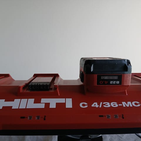 Hilti tigersåg med tillhörande batterier och laddare. Verktyget är batteridrivet och levereras med två batterier samt en laddare för att säkerställa kontinuerligt bruk.