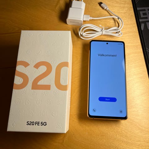 Samsung Galaxy S20 FE 5G mobiltelefon med 128 GB lagringsutrymme i färgen cloud white.