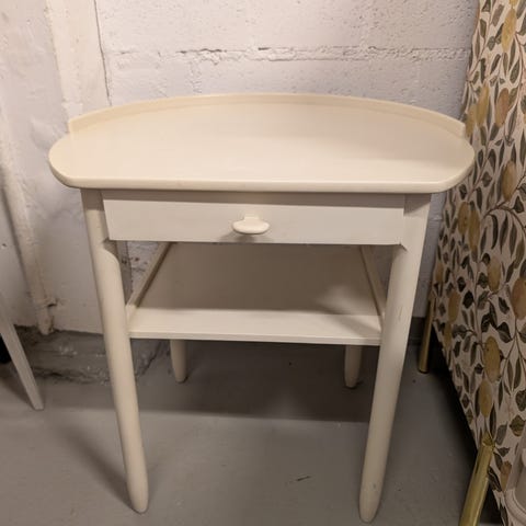 Sängbord i trä med måtten 50 cm i höjd, 40 cm i bredd och 56 cm i djup. Har en öppen hylla och metallben. Färgen är träfärgad med svarta ben.