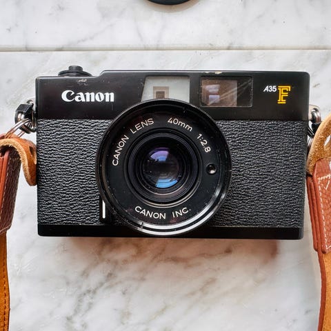 Analog kamera Canon AF35M II. Funkar som den ska men batteriluckan är trasig och går inte att stänga igen.