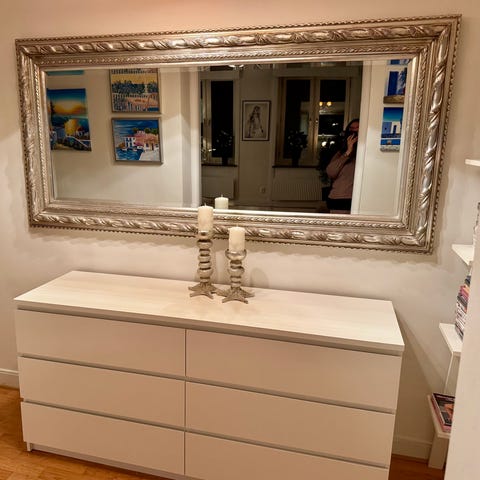 Vit Malm från IKEA. Sexlådig byrå, topp med uppfällbar spegel.