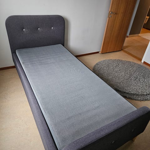 Säng med ribbotten. Använd av stort barn/tonåring några år och sedan enbart som gästsäng. Tyget är lite slitet men det syns inte när sängen är bäddad. Bäddmadrassen ser ut som ny (väldigt lite använd), av märke Wellpur Oeko-tex standard 100. Båda säljes tillsammans.