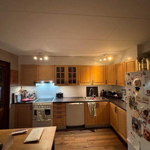 Kök från Tibro med flera skåp och lådor för förvaring. Utrustad med bänkskiva och diskho. Det som ingår är stommar, skåp, luckor, bänkskiva, diskho, blandare, köksfläkt enligt bilderna. Högskåp för integrerad kyl och ugn+micro ingår men syns knappt på bilderna.