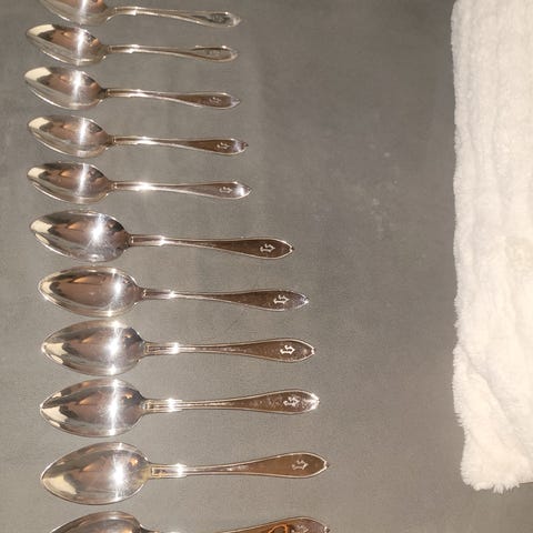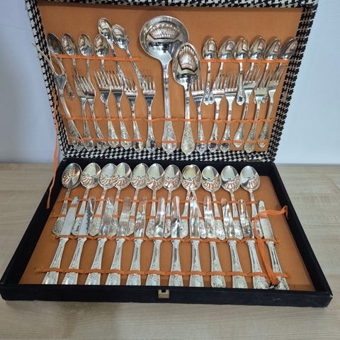Wallace Silver Co Bestickset i silver. Setet innehåller flera olika bestickdelar för olika användningsområden. Förvaras i en originalask med mjukt fodral! 18 stycken skedar! 200 gram