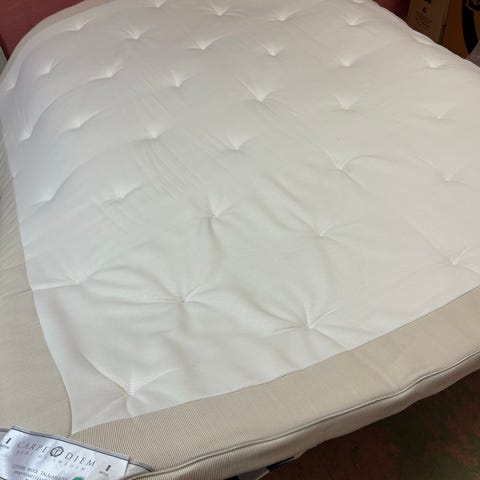 Dubbelsäng från carpe Diem. Färgen är ljusbeige och den har två sidor, en mjuk och en medium fast.
